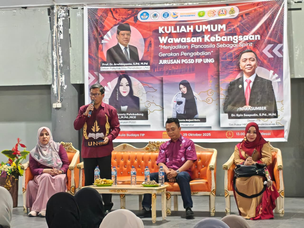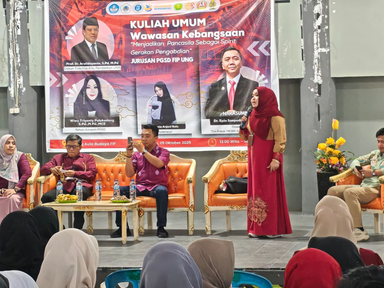 Gorontalo – Rabu, 29 Oktober 2025. Program Studi Pendidikan Guru Sekolah Dasar (PGSD), Fakultas Ilmu Pendidikan (FIP) Universitas Negeri Gorontalo (UNG) kembali menyelenggarakan kegiatan Kuliah Umum Wawasan Kebangsaan dengan tema “Menjadikan Pancasila Sebagai Spirit Gerakan Pengabdian.” Kegiatan ini dihadiri oleh Dekan FIP, Wakil Dekan III Bidang Kemahasiswaan, Ketua dan Sekretaris Jurusan PGSD, dosen-dosen, serta mahasiswa PGSD dari semester I, III, dan V.