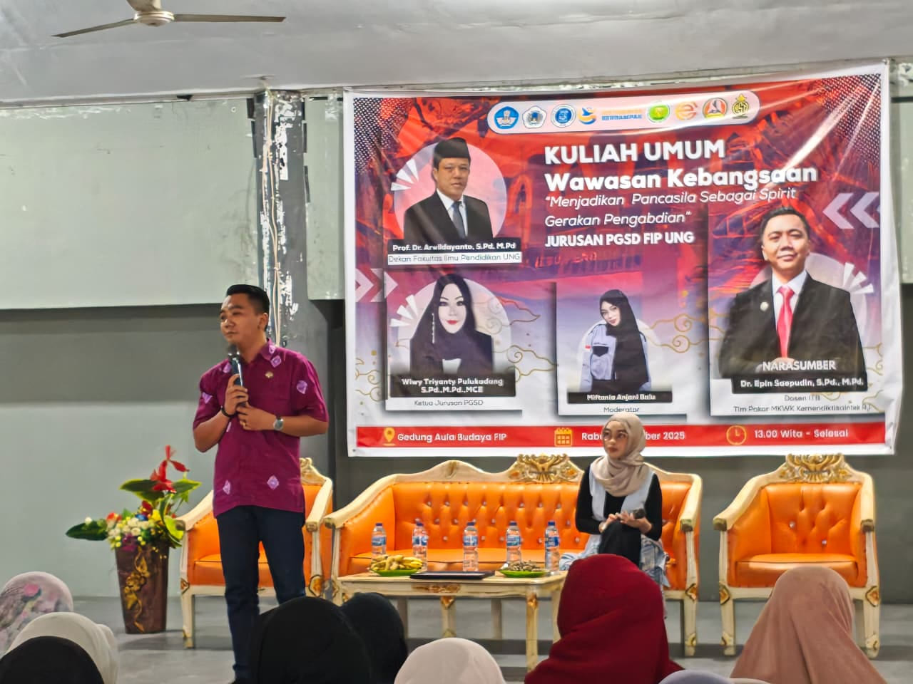 Sementara itu, Dekan FIP UNG Prof. Dr. Arwildayanto, S.Pd., M.Pd. dalam sambutannya menyampaikan rasa bangga terhadap Jurusan PGSD yang terus aktif berinovasi hingga berhasil mempertahankan akreditasi unggul. Beliau juga memperkenalkan narasumber utama, Dr. Epin Saepudin, S.Pd., M.Pd. dari Institut Teknologi Bandung (ITB), seorang akademisi dan Tim Pakar MKWK Kemendikti Saintek R.I. Adpun dekan FIP UNG juga menegaskan pentingnya peningkatan wawasan kebangsaan di kalangan calon guru, karena guru merupakan pelopor dalam membangun karakter bangsa. “Guru yang berjiwa Pancasila bukan hanya cerdas dalam ilmu pengetahuan, tetapi juga menjadi teladan dalam moral dan pengabdian,” ujarnya.